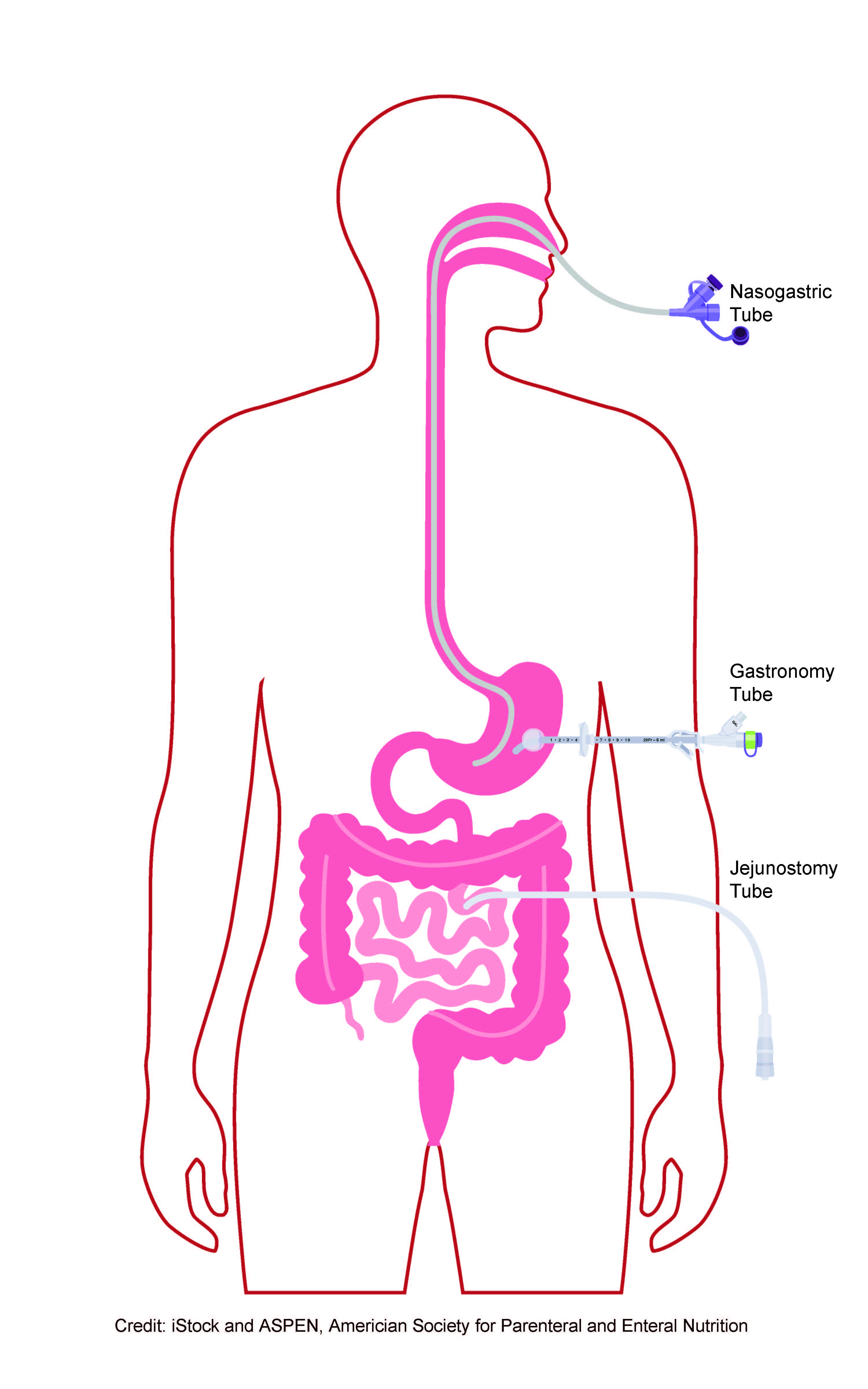 - Tubes placed through the nose into the stomach (nasogastric) or the small intestine (nasoduodenal/nasojejunal). These tubes are called nasoenteral tubes.