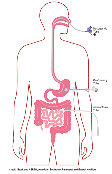 Enteral nutrition is administered through an enteral access device, also called a feeding tube. There are several types of feeding tubes:
